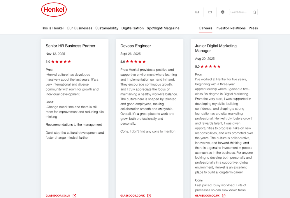 Henkel has integrated Glassdoor testimonials onto the corporate site – a trust signal that will be picked up by jobseekers and AI algorithms alike.